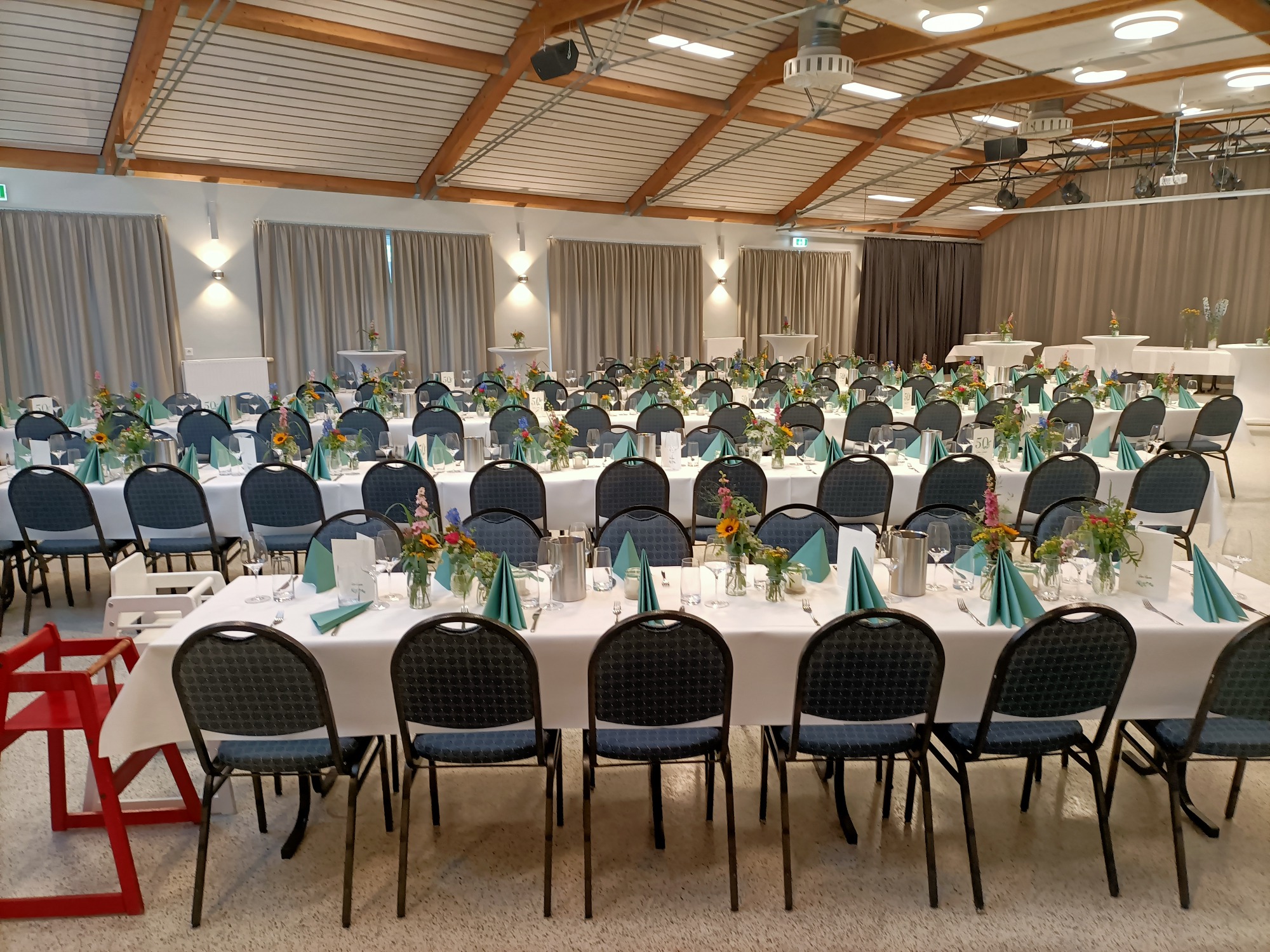 Der Saal verfügt über einen direkten Zugang zur Terrasse sowie zur Theke, wodurch Pausen, Bewirtung und ein angenehmer Ablauf der Veranstaltung besonders komfortabel gestaltet werden können.