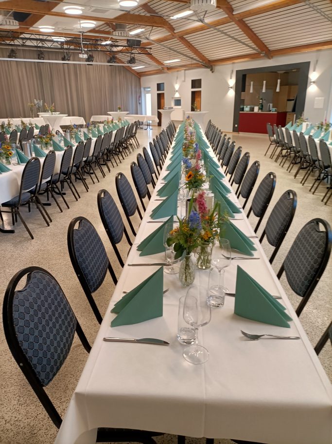 Tische und Stühle können flexibel in verschiedenen Formationen angeordnet werden – ideal für Seminare, Feiern, Versammlungen oder kulturelle Events.